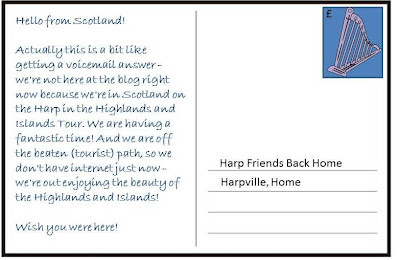 I’ll tell you about important stuff: travel to Scotland, growing as a harp player, and other essential stuff, like playing the harp while we’re in Scotland! I’ll also highlight harp events or other excitement in our harp world that I think would be interesting to you.