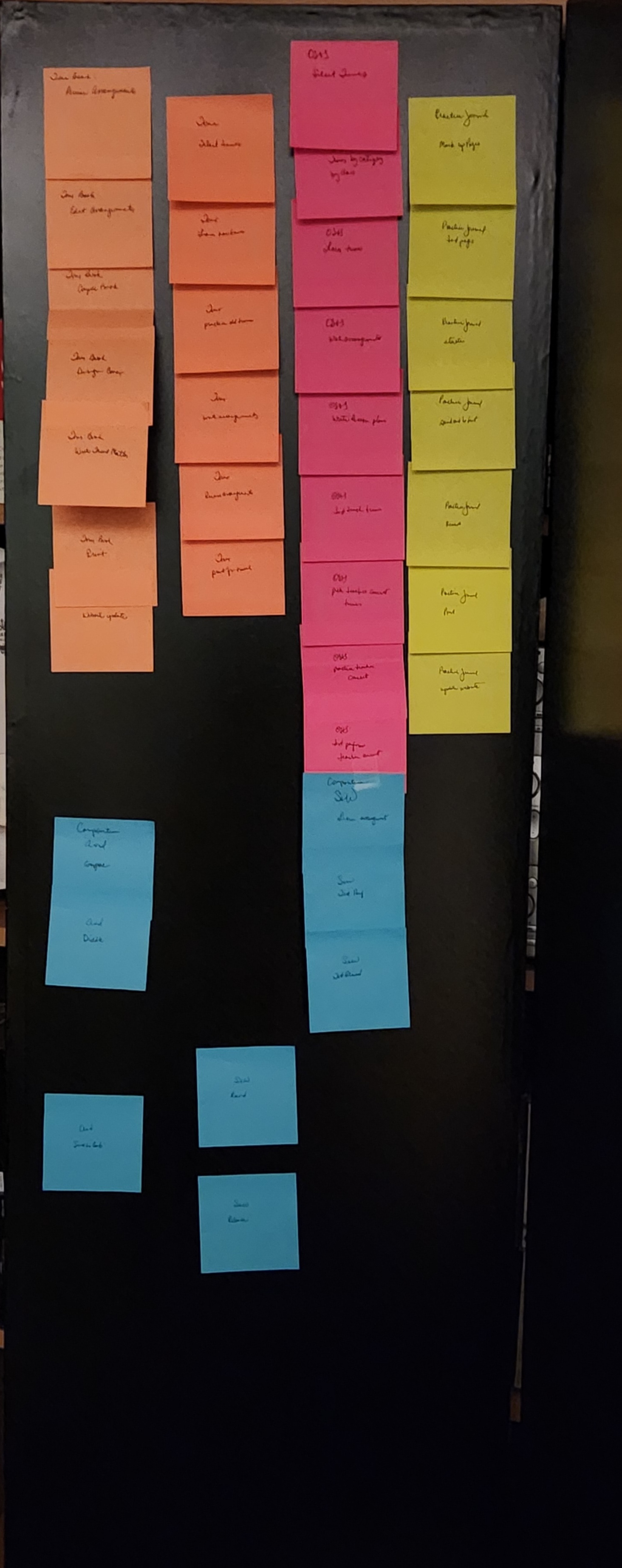 You may have seen similar systems in your travels – this is much like kanban or scrum. Not surprising since I am a systems engineer when I’m not being a musician**, so of course I cross my tools between domains (goose/gander, etc.). The differences are that this is just for you, not a group (although you could use it for ensembles!), it is not as rigorous because we’re not building bridges (except ethereally) and we only need as much rigor as is required and not more, Finally, while on the one hand preparing music is a “project” on the other hand, it’s more than that – we’re making art not planning to pour cement or launch wonky code.